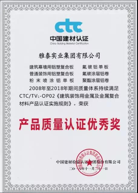 會上,雅泰產(chǎn)品憑借2008年至今2018年期間質(zhì)量體系持續(xù)滿足CTC/TVL-OP02《建筑裝飾用金屬及金屬復(fù)合材料產(chǎn)品認證實施規(guī)則》,榮獲2018年度CTC產(chǎn)品質(zhì)量認證優(yōu)秀獎。YARET牌鋁塑復(fù)合板,2015年至2018年期間經(jīng)中國建材檢驗認證集團股份有限公司抽樣全項檢測,產(chǎn)品質(zhì)量符合中華人民共和國國家標準(GB/T 17748-2016/2008、GB/T22412-2016),被授予2018年度產(chǎn)品合格證。