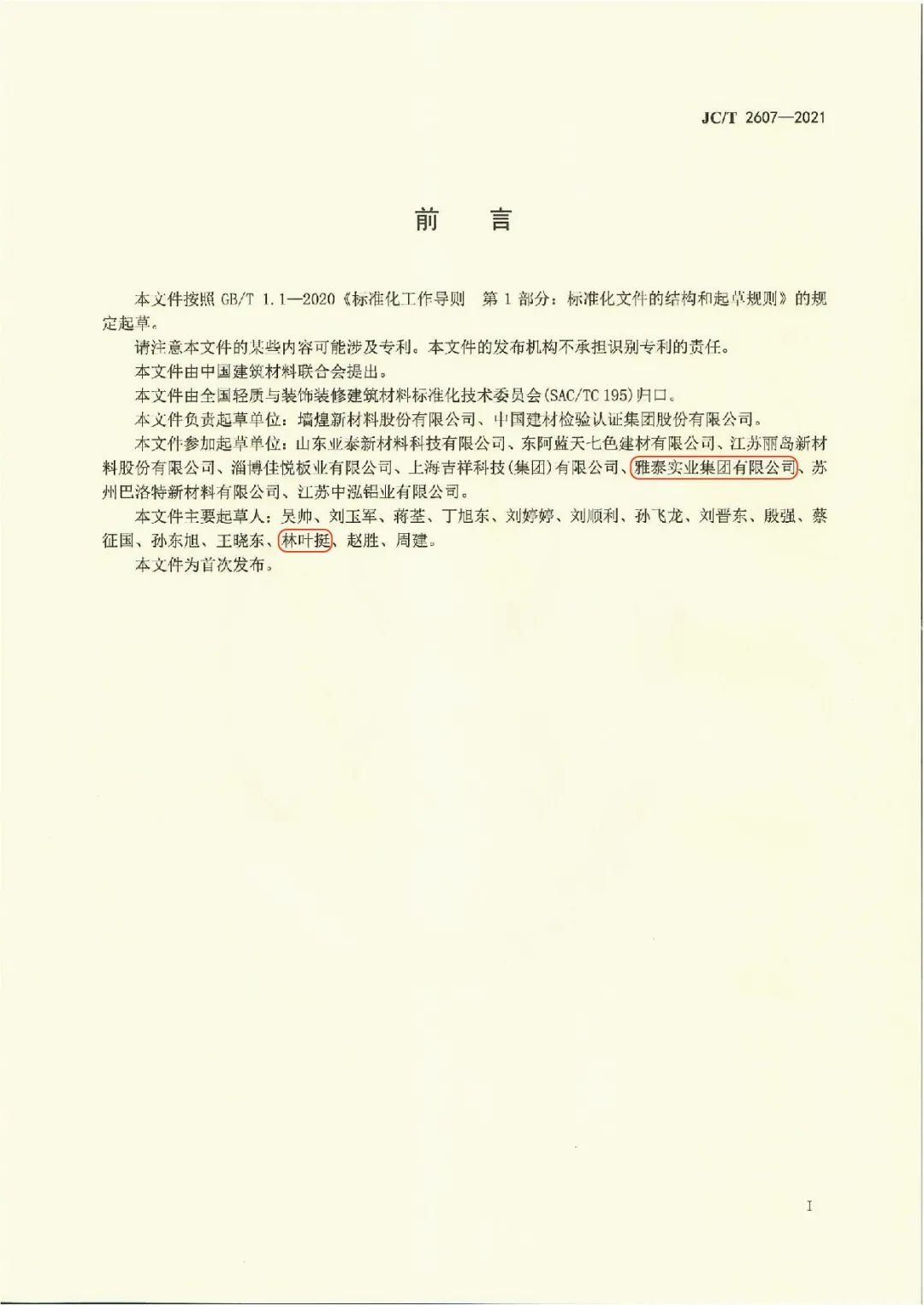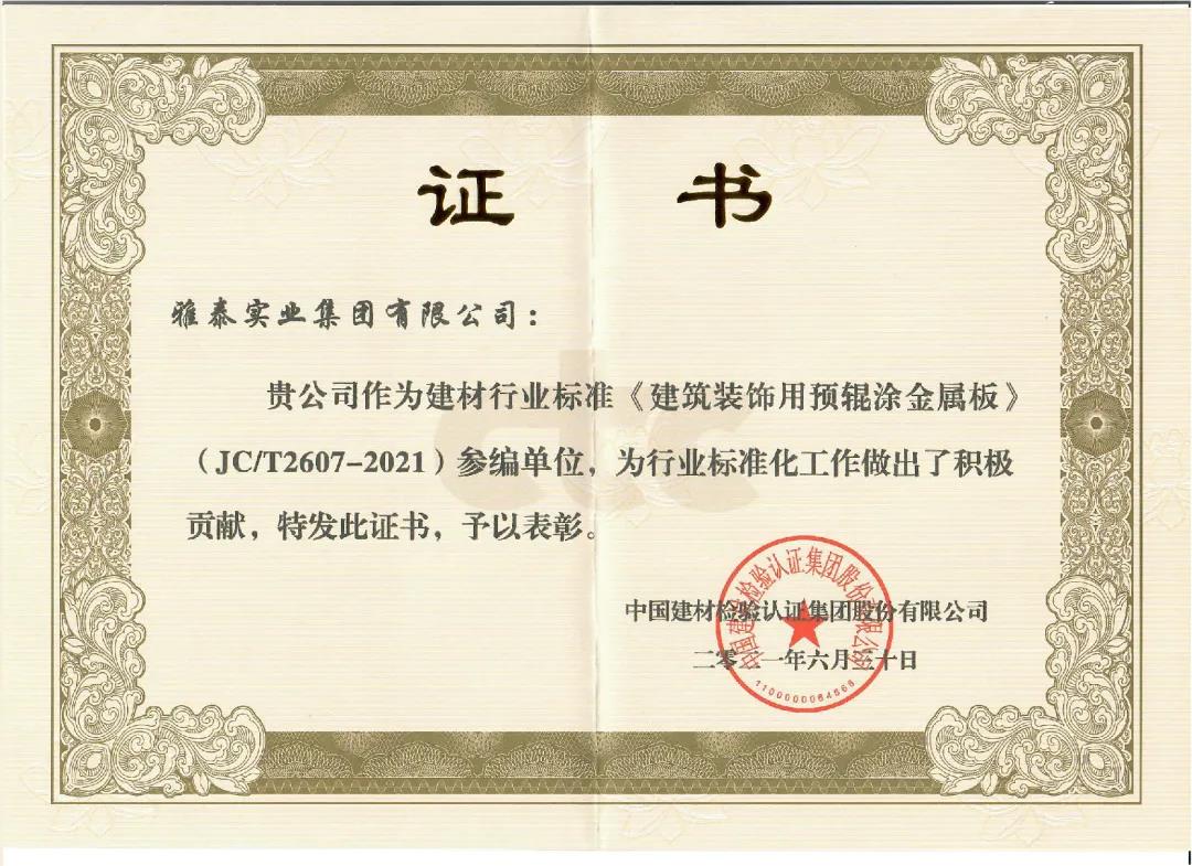 近日,由中國建筑材料聯(lián)合會提出,雅泰實(shí)業(yè)集團(tuán)參與起草的《JC/T2605-2021建筑裝飾用氟碳覆膜金屬板》、《JC/T2607-2021建筑屋面用預(yù)輥涂金屬板》兩項(xiàng)行業(yè)標(biāo)準(zhǔn)于2021年3月5日發(fā)布,同年7月1日正式實(shí)施,公司技術(shù)部經(jīng)理林葉挺為此次兩項(xiàng)行業(yè)標(biāo)準(zhǔn)的主要起草人之一。